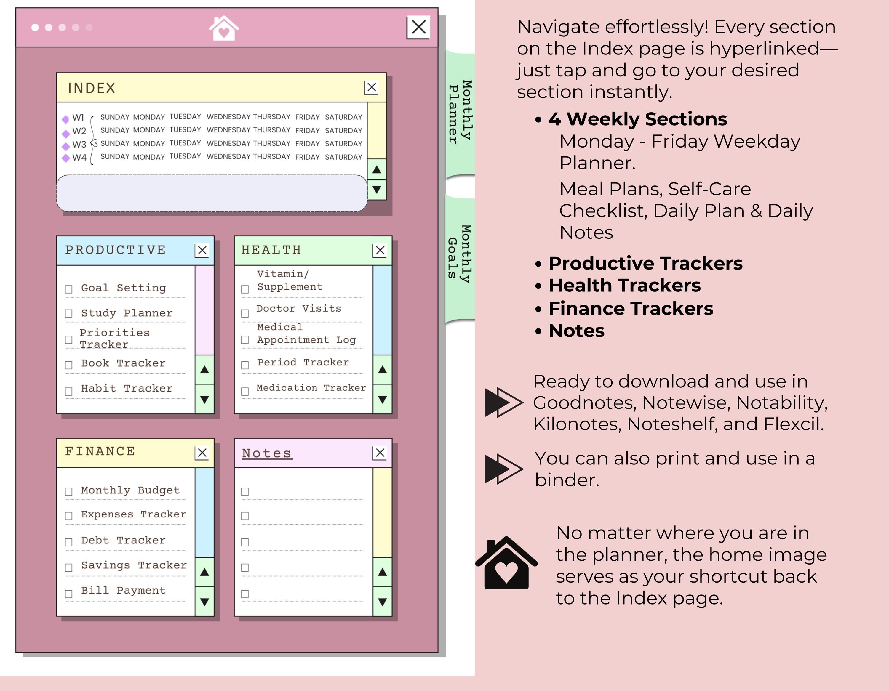 Digital Planner Hyperlinked GoodNotes Template – iPad & Android Compatible, Weekly & Monthly Organizer, Self-Care Checklist