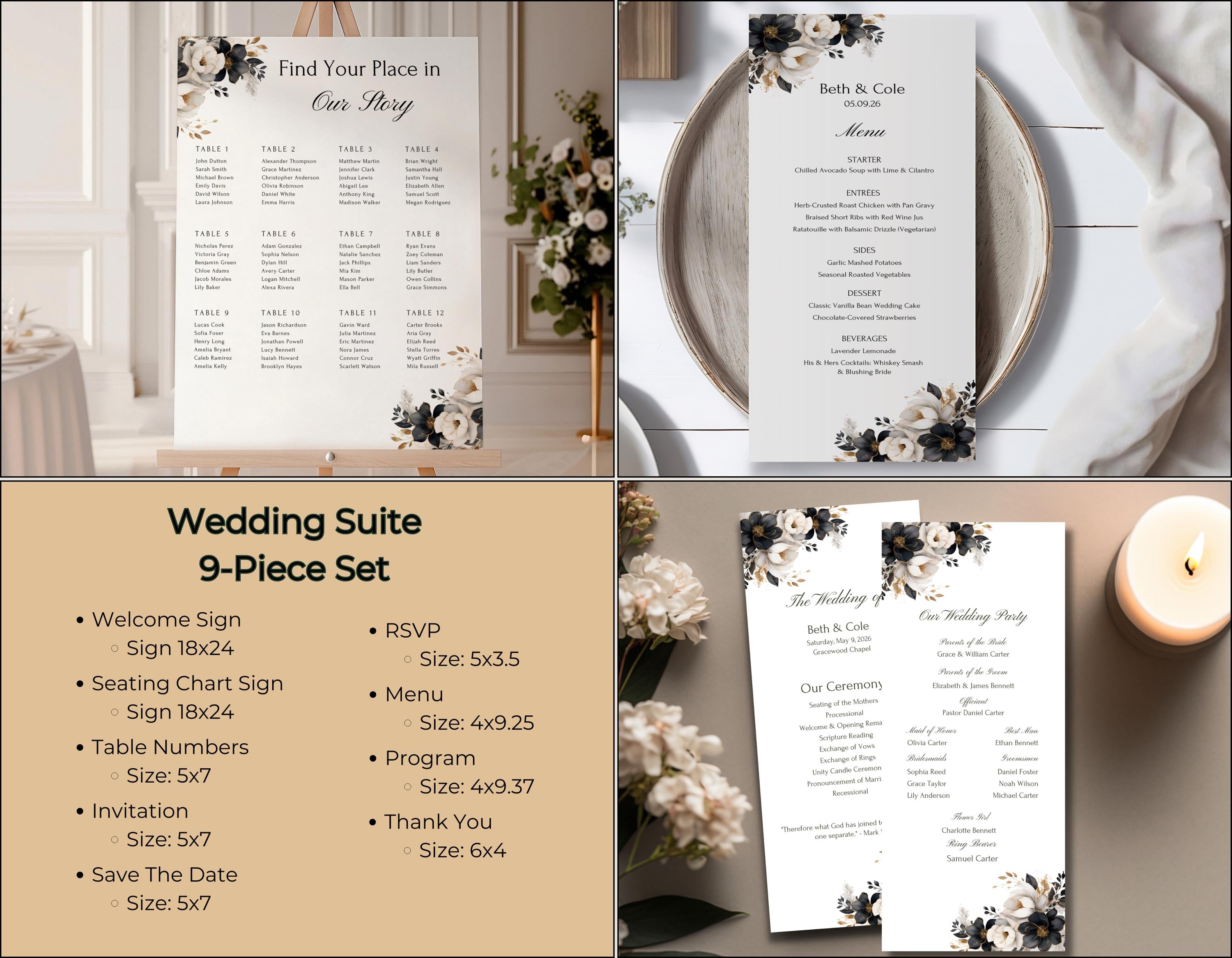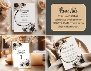 Gothic Floral Wedding Suite Digital Download - Customizable Black & Cream Invitations | DIY Dark Romantic Wedding Stationery Set